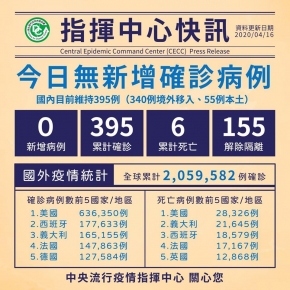 今日(4/16)無新增確診病例,0確診 恭喜!!!臺灣 再次成功防疫!感謝所有醫護人員的努力~