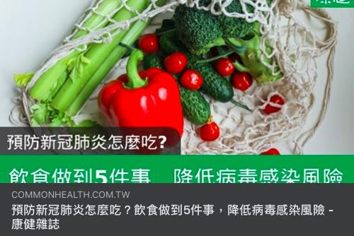 「防疫小尖兵」 除了做好個人衛生習慣,充足的營養可以提升免疫力 預防新冠 肺炎 飲食5招學起來 1.蔬果、全穀類食物,補充微量元素 2.肉、蛋、豆、奶和魚類,補充蛋白質 3.喝充足的水 4.挑好油吃 5.糖和鹽少吃 共同防疫,你我有責 引用自 https://m.commonhealth.com.tw/amp/article/84230