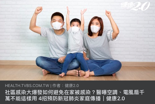 「防疫小尖兵」 教您4招避免新冠肺炎家庭傳播 1.勤洗手戴口罩 2.家庭消毒 3.空氣流通 4.衛生人員介入 共同防疫,你我有責! 引用自 https://health.tvbs.com.tw/amp/medical/328136