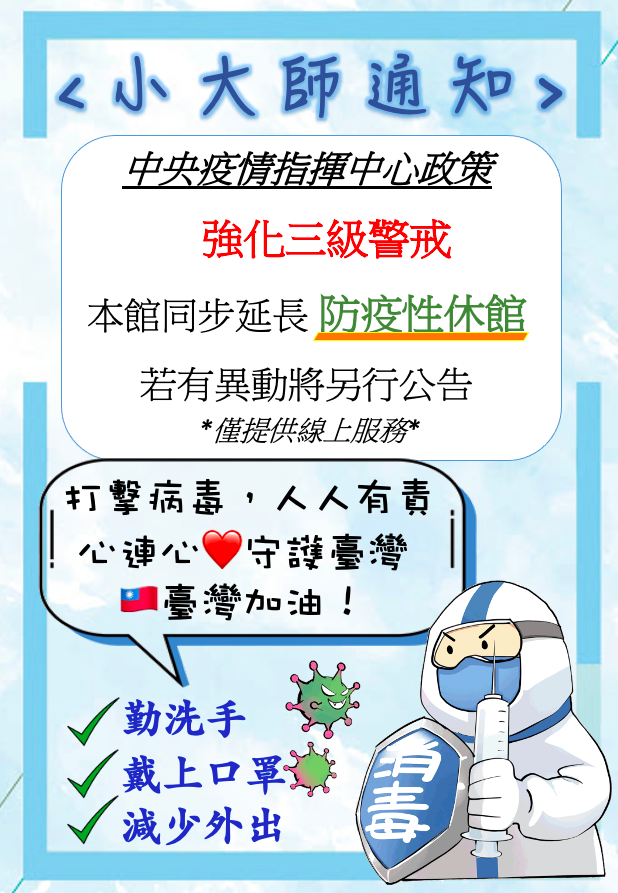 「*重要公告*」 各位親愛的家長和小朋友們~ 因應 中央疫情指揮中心政策 強化三級警戒 *羅斯福館和水新館 *同步延長 防疫性休館 *僅提供線上服務 若有異動將另行公告 大家一起守衛臺灣,讓孩子們安心快樂的成長,期待見到健健康康的小大師們! 戴口罩 勤洗手 減少外出 共同防疫你我有責!