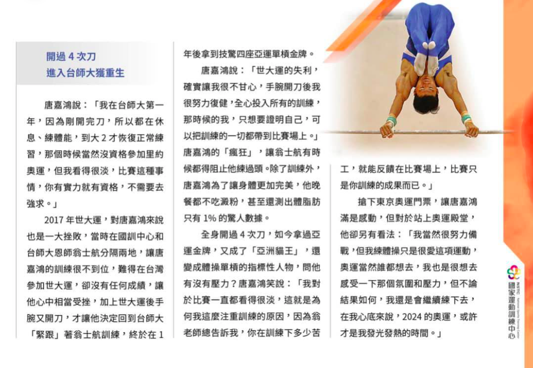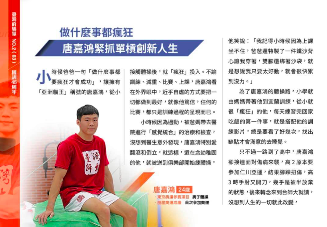 「臺灣的驕傲」 國家運動訓練中心特別報導國訓45週年! 各大臺灣運動界的好手新星採訪,其中有我們的體操亞洲貓王唐嘉鴻老師呢~ 首次即將踏上奧運的舞臺,趕來看看嘉鴻老師的心路歷程吧!讓我們一起為他加油!臺灣加油!