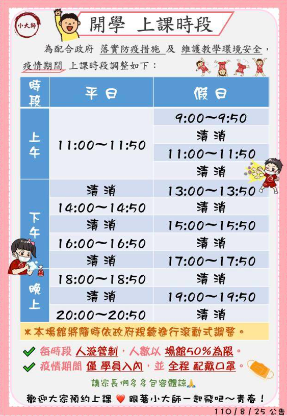 *由於 課程時段減少且館內人數限制,課程名額有限,若遇滿班情況,會先預約登記 [[候補]]