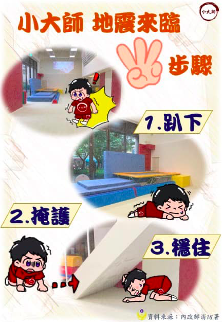 「小大師 地震防護步驟!」 小朋友~當在上課時地震發生了我們該怎麼保護自己呢? *小大師地震來臨3步驟* 1.趴下 2.掩護 3.穩住 地震發生時,通常不是天花板先崩塌,而是物品掉落或移位造成人被砸傷或壓住! 因此,地震發生的第一時間,應迅速趴下並以手保護頭部和頸部 然後躲到穩固的桌子或是物體下作為掩護,當隨地震移動時形成防護屏障,避免受傷 回列表