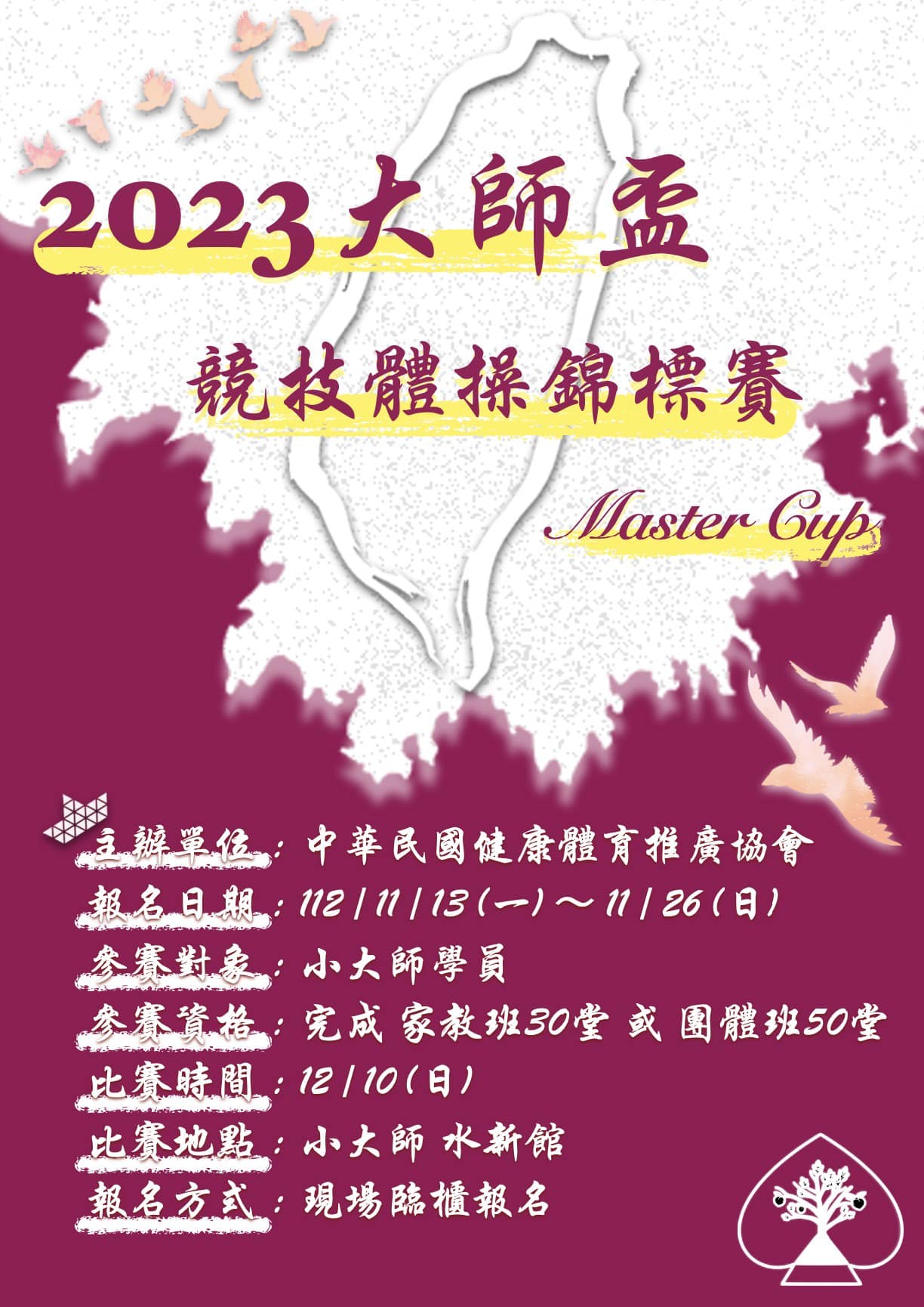 「小大師 X 大師盃」 **2023大師盃預告** 比賽日期:12/10(日) 比賽地點:小大師 水新館 參賽對象:小大師學員 年齡範圍:4~15歲 參賽資格:須完成團體班50堂or家教班30堂 報名日期:11/13(一)~11/26(日)止 報名方式:臨櫃現場報名 小大師年底的最後一場比賽!今年也要完美落地! 歡迎報名參加~給孩子一個展現自己的舞台 #小大師體操俱樂部 #兒童體操 #竹北館 #中正館 #水新館 #羅斯福館