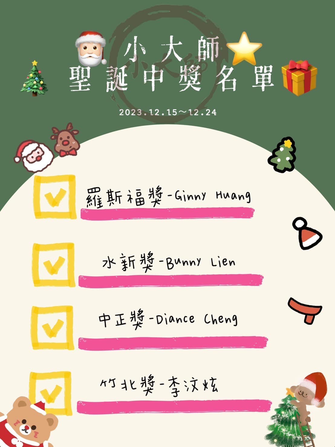 「*聖誕抽獎公佈*」 感謝各位家長熱情的參與~ 2023謝謝大家對小大師的支持肯定 我們會繼續努力帶著孩子成長翻滾! 恭喜以下得獎者 Ginny Huang Bunny Lien Diance Cheng 李汶炫 (請得獎者私訊我們喔!) 祝福大家聖誕節快樂 新年快樂喔! #小大師體操俱樂部 #聖誕快樂 #竹北館 #中正館 #水新館 #羅斯福館