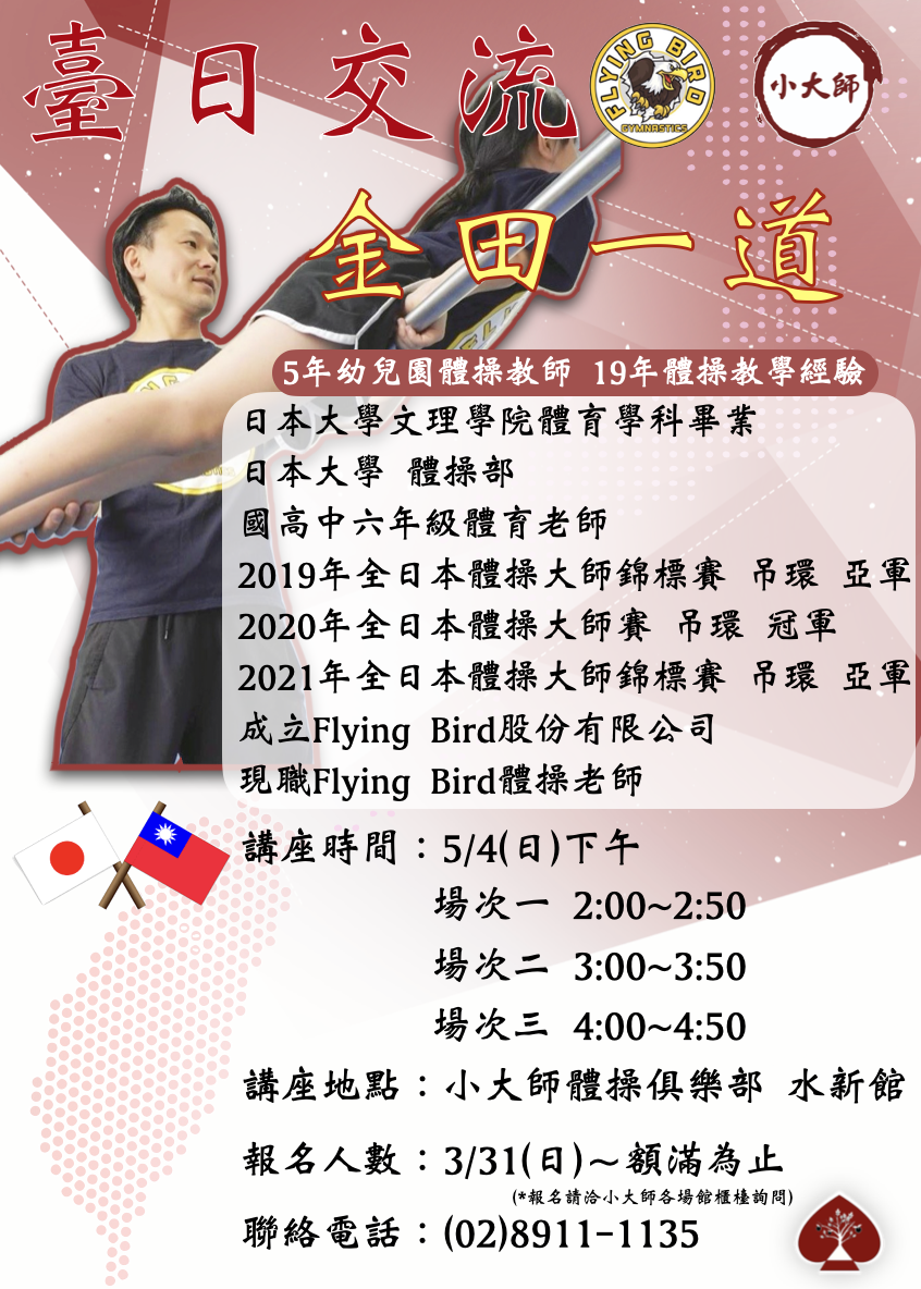 「日本X臺灣 小大師體操國際交流講座」 ~!熱情歡迎!~ 日本 金田一道 講師 再次來臺灣開講囉! 金田老師為小朋友們帶來超級精彩的體操講座~ 實在太期待了~~ 講座時間: 2025/5/4(日) 下午2:00-2:50 下午3:00-3:50 下午4:00-4:50 講座地點: 小大師水新館 (新北市新店區光明街230號) 歡迎有興趣的家長可以詢問各館喔! 主辦單位:中華民國健康體育推廣協會 協辦單位:小大師體操俱樂部