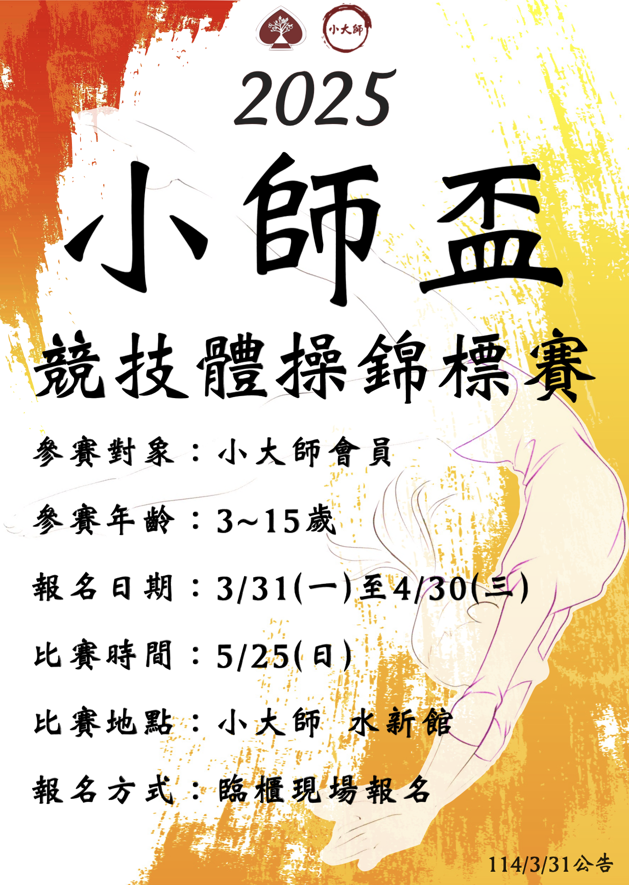 「2025小師盃開始報名」 今年第一場比賽! 小師盃競技體操錦標賽開始報名囉! *比賽日期:5/25(日) *比賽地點:小大師 水新館 *參賽對象:小大師學員 *年齡範圍:3~15歲 *參賽資格:須完成團體班25堂or家教班15堂 *報名日期:即日起 至 4/30(三)止 *報名方式:臨櫃現場報名 給孩子們一個展現自己的舞台吧!!!、 #小大師體操俱樂部 #竹北館 #中正館 #水新館 #羅斯福館 #2025小師盃
