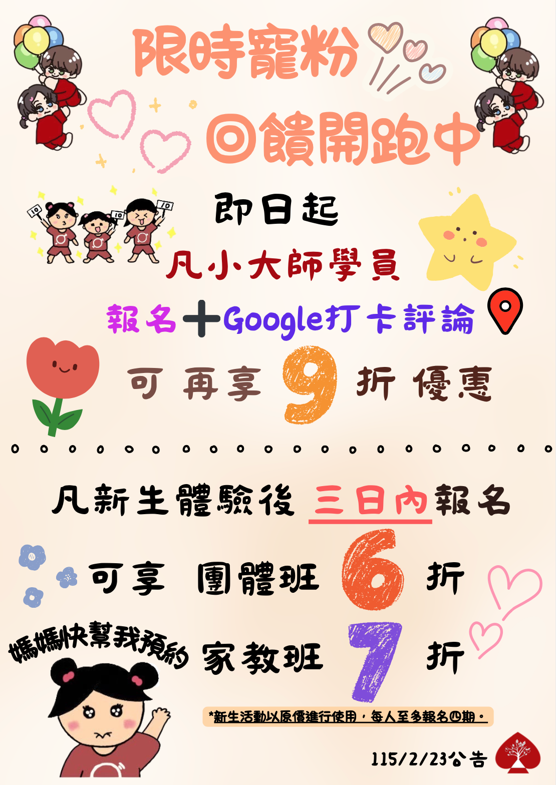 「小大師開學季」 新學期 開心學 孩子想學習新的興趣和運動嗎? 小大師是您最好的選擇 安全、有趣、翻滾迎開學 即日起報名可享有 團體班 最低6折 家教班 最低7折 還有 限時寵粉活動 凡小大師學員 報名+打卡評論 可再享9折優惠 凡新生體驗後 三日內報名 可享團體班6折 家教班7折 (新生以原價活動進行使用,每人至多四期)